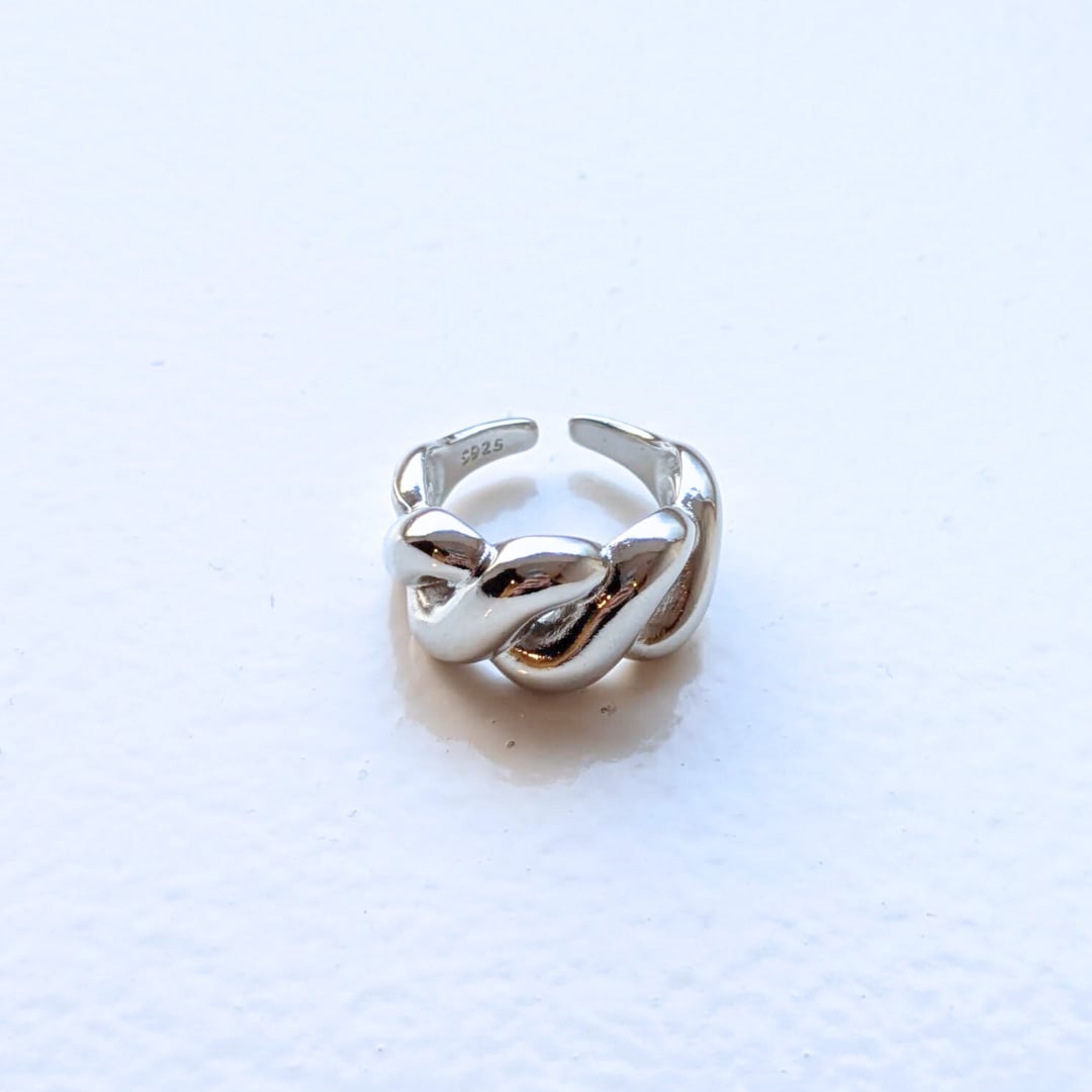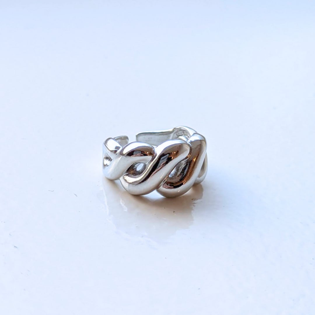 目を引くツイストのシルエットが印象的なデザインのリング。